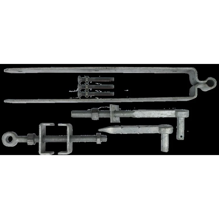 Afhangset verstelbaar met 1 x heng dubbele band, 1 x verstelbare oogbout met beugels, 1 x inslagduim pen 19 mm en 1 x verstelbare duim met bout pen 19 mm, thermisch verzinkt, lengte duimheng 600 mm, pen rond 19 mm, met slotbouten. Voor hekdikte van 75 mm.