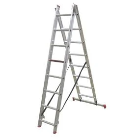 Aluminium, blank. Model reform-ladder, 2-delig. Te gebruiken als reformladder, opsteek(schuif)ladder en vrijstaand. Ladder voor de Doe-Het-Zelver. Sporten met D-vorm voor een breed horizontaal stavlak in de klimstand. Met twee banden als spreidbeveiliging. De opsteekhaak waarborgt de ladder bij iedere sport tegen inschuiven. Met stabiliteitsbalk. Belastbaar tot 150 kg.