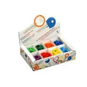KUNSTSTOF. Toonbankdoos met 200 stuks, gesorteerd in de kleuren: rood, geel, donkerblauw, lichtblauw, donkergroen, lichtgroen, oranje en bruin.