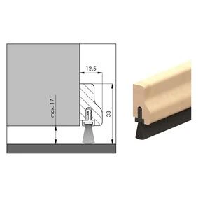 model HDS. Beuken profiel. Voorzien van schroefgaten. Met zachte velours borstel. Voor naar binnen en buiten draaiende deuren zonder dorpel, schuif- en roldeuren in bestaande bouw. Het profiel van hout wordt geschroefd op de deur. Afmetingen profiel inclusief borstel. Dit profiel is overschilderbaar. In DHZ-verpakking, compleet met schroeven.