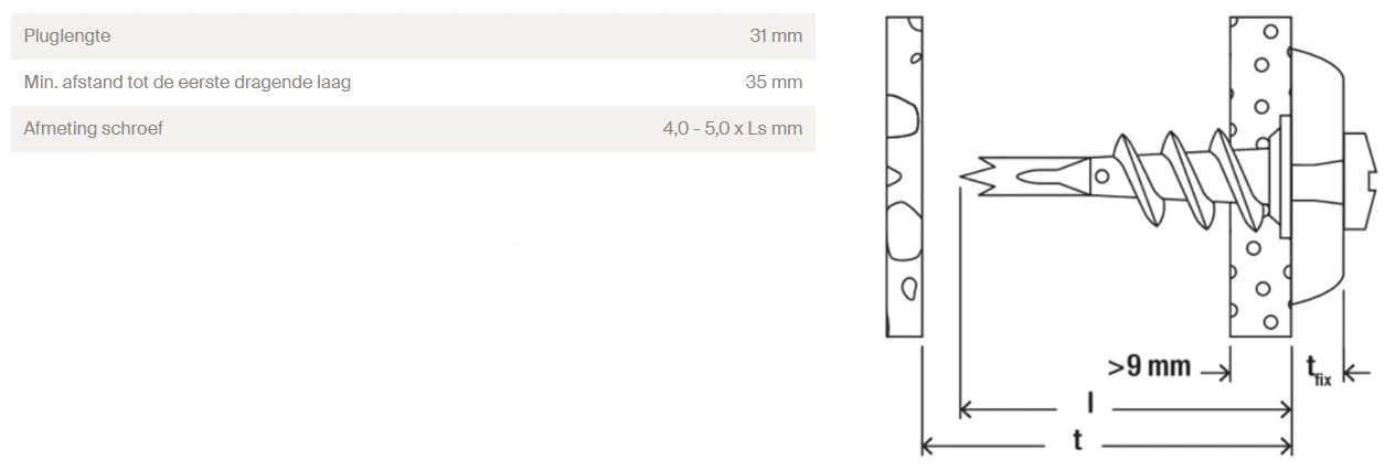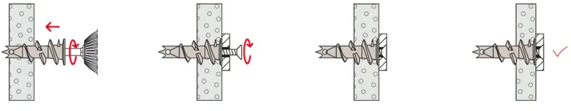 - Bij gipsplaten en of dubbele gipswanden met een boor Ø 8 mm voorboren.Â