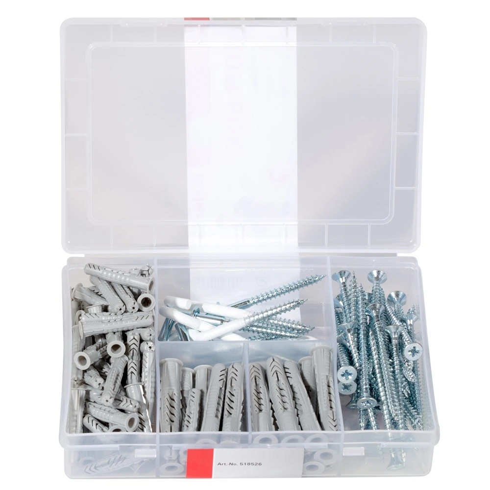 Deze hoogwaardige assortimentsbox van Fischer bevat diverse pluggen, schroeven en haken die netjes en overzichtelijk gesorteerd zijn. Door de transparante deksel heb je een duidelijk overzicht in één oogopslag. Verder hoef je niet te zoeken, omdat alles netjes voorgesorteerd is. Als laatst kun je deze stevige Fischer Meister-box afsluiten en opnieuw vullen met pluggen. De assortimentsbox bevat de volgende pluggen, schroeven en haken: