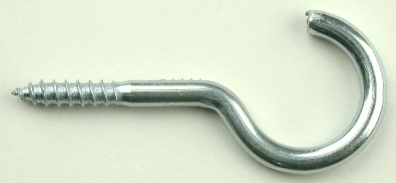 Zwaar model. Voor o.a. het ophangen van lampen of de bevestiging van waslijnen. STAAL, GLANSVERZINKT. Met houtdraad en gebogen haak.