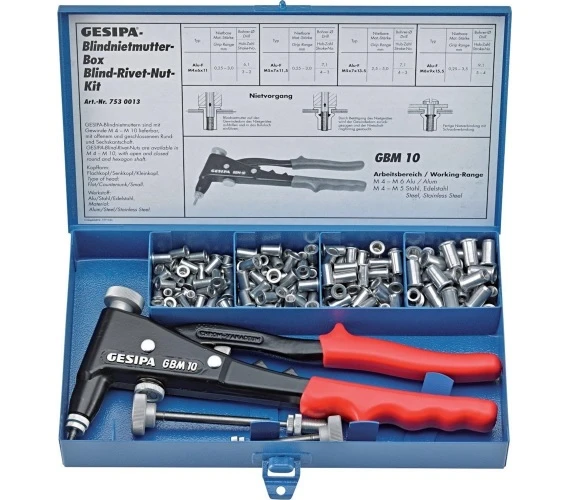 Popnageltang met assortiment popnagels. Inhoud: 1 popnageltang GBM 10, mondstukken en trekstangen M4, M5 en M6. Geschikt voor aluminium, staal, messing en roestvrijstalen popnagels M4 t/m M6. Verpakking: stevige metalen opbergkist.