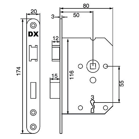 Het Dag&Nacht slot heeft een afgeronde voorplaat met stervormige schroefgaten en zwart gelakte finish. De schoten zijn zamac vernikkeld en kunnen in 3 stappen omkeerbaar gemaakt worden voor zowel links- als rechtsdraaiende deuren. De slotkast heeft afgeschuinde rechte hoeken voor een universele toepassing. Het slot wordt geleverd inclusief bijbehorende verzinkte sluitplaat en 2 bontebaardsleutels. De doornmaat is 50mm en de PC- maat 55mm. De voorplaat heeft een afmeting van 174 x 20mm. Zie alle afmetingen van het slot op de afbeelding.Â