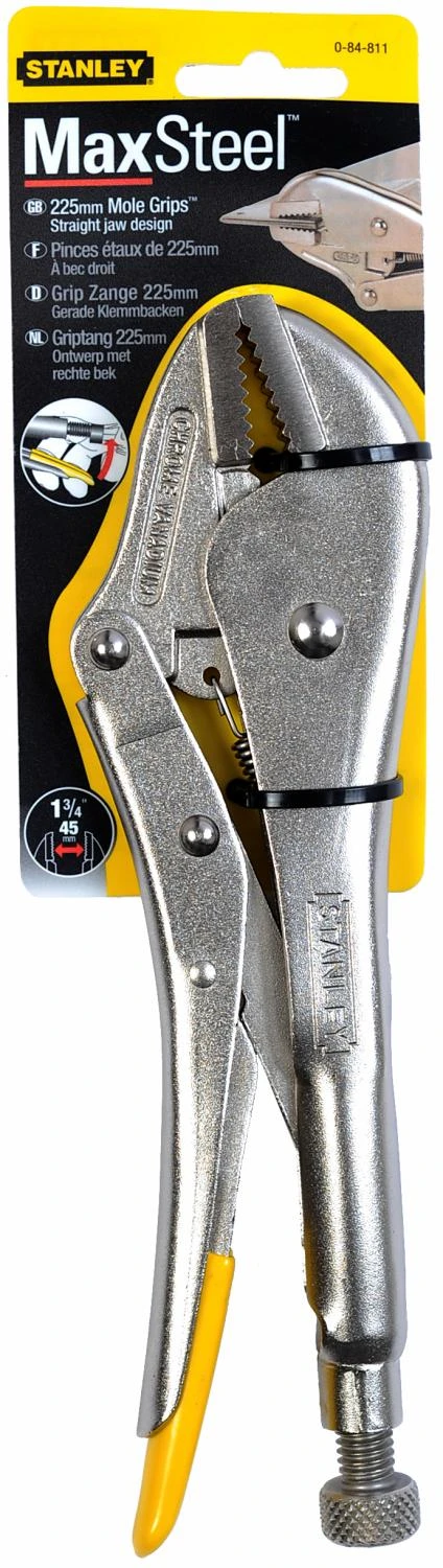Deze Stanley Stanley griptang heeft een klemdiepte van 50 millimeter. De griptang heeft een antiroest chroom behuizing. De bekken zijn nauwkeurig afgewerkt en zijn vertanding over ganse bek. De klemkracht is af te stellen met een schroef waardoor het