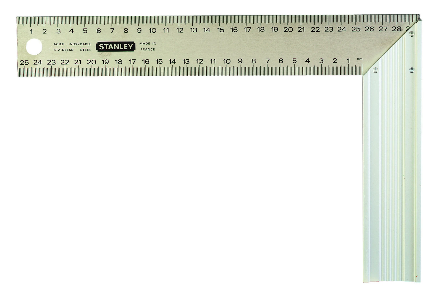 Deze winkelhaak van Stanley heeft een fotografisch geëtste mm-verdeling op roestvrij staal, wat het maatverdeling duidelijk zichtbaar maakt.