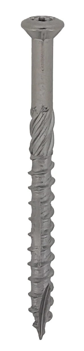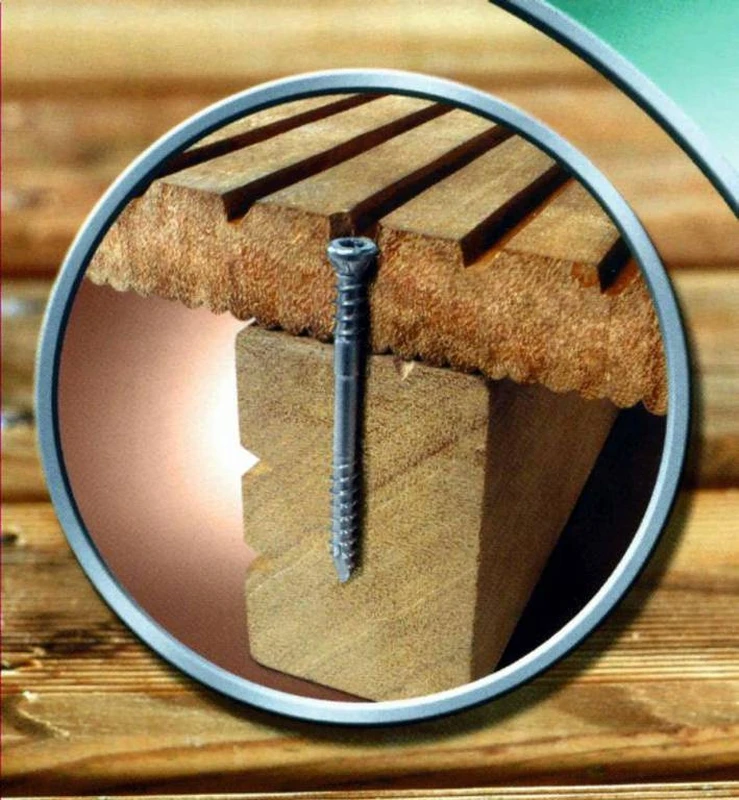 Aan de punt van de vlonderschroeven zitten snijkantjes. Dit werkt als een soort voorboren. De snijkantjes zorgen ervoor dat de vlonderschroeven gemakkelijk door het harde hout heen draaien.
