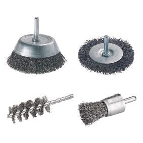 Draadborstels voor boormachine. Set bestaande uit: schijfdraadborstel 75 x 10 mm, komborstel 75 mm, cilinderdraadborstel 28 x 60 x 90 mm, veiligheids-penseel-draadborstel 25 mm.